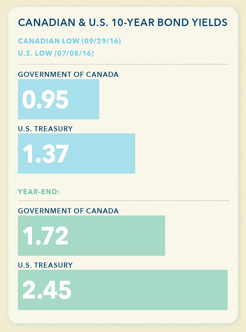 It was Canada’s year to shine, finishing 2016 as the best-performing developed market in the world. That’s a reversal from 2015, when it was one of the worst. The change was thanks to the recovery in oil prices. With resource stocks representing a third of our market, it’s no surprise that the S&P/TSX handily outperformed the S&P 500. This occurred even as Canada’s economy scratched along at roughly 1% GDP growth.