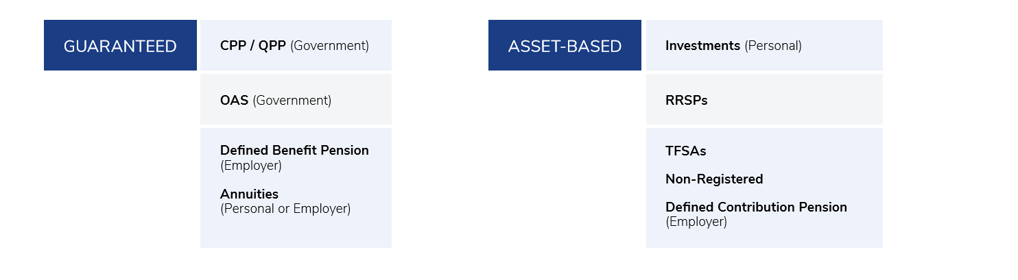 In retirement, you should plan to draw an income from multiple sources. The two most common types of income you can expect come from either ‘guaranteed’ or ‘asset-based’ sources: