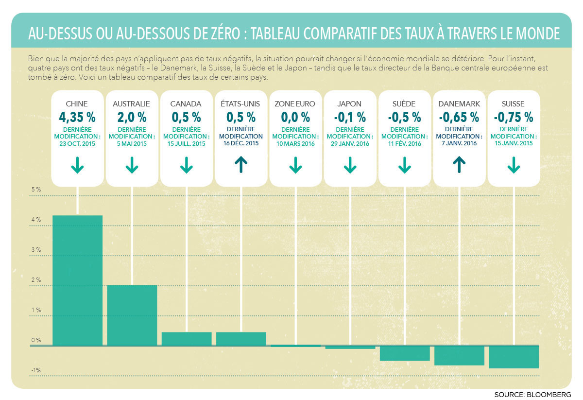 Avant d’entrer dans le vif du sujet, mettons les choses en contexte. Il y a quelques années à peine, l’idée que les taux puissent être inférieurs à zéro était purement théorique, car il semblait peu probable que cela se produise. Toutefois, comme l’économie mondiale n’a pas progressé aussi rapidement que prévu au sortir de la récession et que de nombreux pays, surtout européens, sont aujourd’hui en panne de croissance, les banques centrales ont été forcées d’innover pour stimuler la croissance.