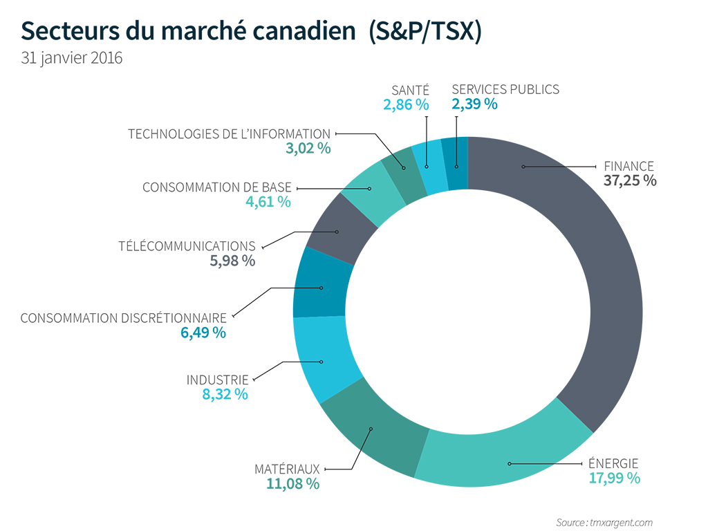 Un coup d’œil à la ventilation par secteur de l’indice composé S&P/TSX révèle rapidement l’aspect problématique (voir le diagramme circulaire) de cette approche. Plus des deux tiers du poids indiciel est en effet représenté par trois secteurs seulement : la finance, l’énergie et les matériaux. Le ralentissement économique mondial qui a frappé les secteurs de l’énergie et des produits de base a également pesé lourdement sur les sociétés financières qui tirent une grande partie de leur chiffre d’affaires des entreprises du domaine des ressources naturelles maintenant en difficulté.