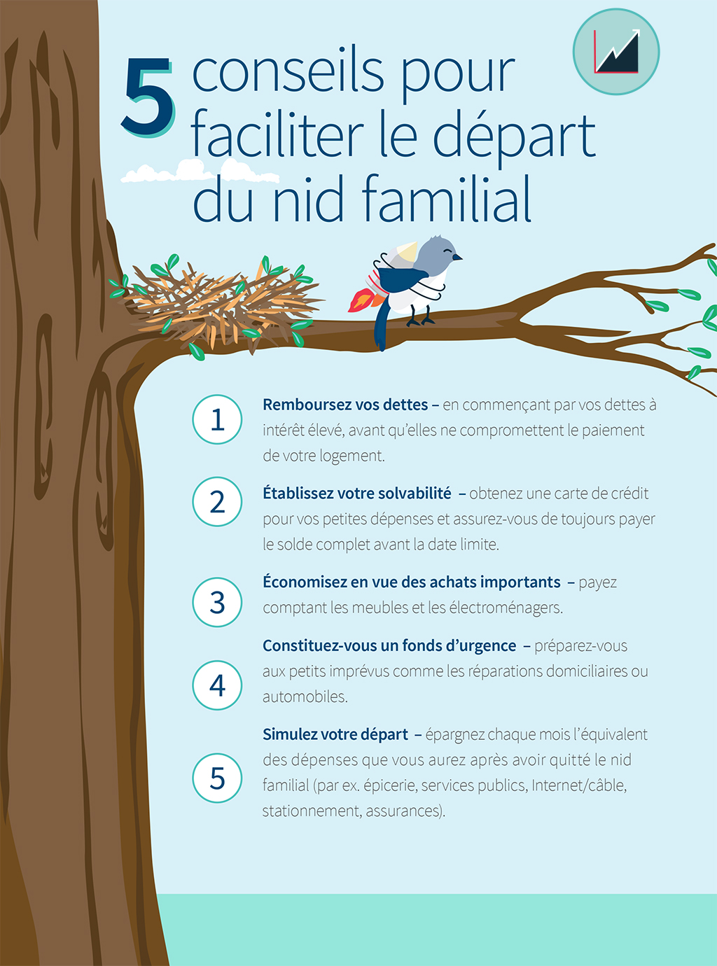 Pour de nombreux jeunes adultes, il est financièrement responsable de vivre chez leurs parents même s’ils travaillent à temps plein. C’est un moyen idéal d’économiser en vue de l’achat d’une maison ou du démarrage d’une entreprise. L’abandon du nid familial est toutefois un important rite de passage, tant pour les parents que pour les enfants. Même si bien des années s’écouleront avant le déménagement, c’est une bonne idée de fixer une date et d’établir un plan.