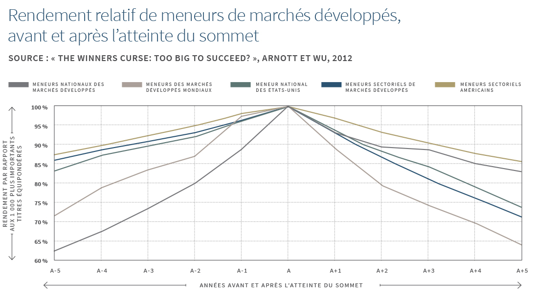 En 2012, Rob Arnott et Lillian Wu ont publié un rapport intitulé The Winners Curse: Too Big To Succeed?, qui analyse le parcours des sociétés boursières dominantes dans le monde de 1952 à 2011. Ils ont constaté, dans les neuf pays sur lesquels a porté leur étude, une tendance marquée où des sociétés, après avoir fait figure de « meneur » au chapitre de la capitalisation boursière, ont inscrit des rendements annuels en moyenne inférieurs de 4,3 % à ceux de l’indice équipondéré de leur pays respectif au cours de la décennie suivante (-3,5 % sur 1 an ; -4,0 % sur 3 ans ; et -4,9 % sur 5 ans). Ce sont les meneurs au Canada qui ont inscrit les pires rendements annuels relatifs moyens, soit 10,0 % sur 10 ans. M. Arnott et Mme Wu ont constaté que la dégringolade d’une société est généralement aussi rapide que son ascension (figure 1).