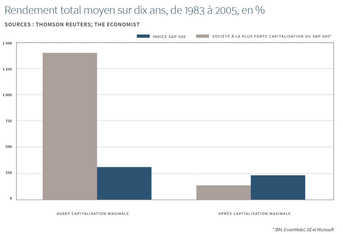 Le magazine The Economist a constaté des résultats similaires après avoir comparé les rendements moyens, avant et après l’atteinte de la position de meneur, de sociétés qui ont dominé l’indice S&P 500 sur le plan de la capitalisation boursière entre 1993 et 2005 (The Curse of the top dog, 7 mars 2015). Au cours des 10 années qui ont précédé leur ascension, ces sociétés ont inscrit des rendements totaux moyens de 1282 %, comparativement à 302 % pour l’indice S&P 500. Pour les 10 années suivantes, leurs rendements moyens ont été de 125 % contre 199 % pour l’indice (figure 2).