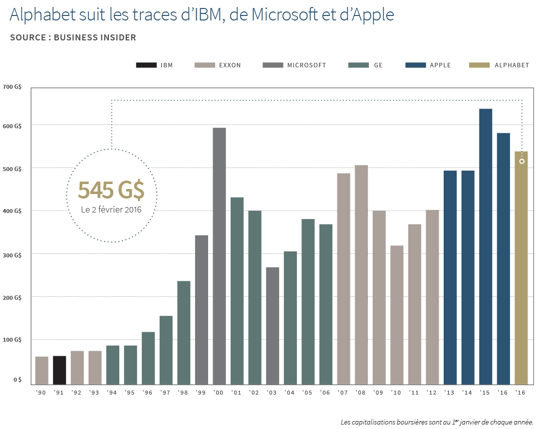 Avant la bulle technologique des années 1990, la société qui affichait la plus forte capitalisation boursière aux États-Unis était généralement un géant industriel (comme General Motors ou Exxon) qui engageait d’importantes dépenses en immobilisations. Les besoins élevés en capitaux créaient des barrières à l’entrée et faisaient en sorte que les dimensions relatives et les classements changeaient lentement. Souvent, une société gardait son titre de meneur pendant plus d’une décennie.