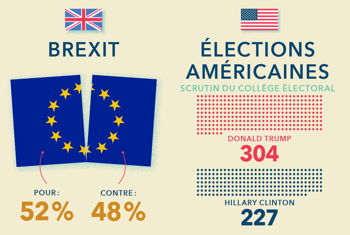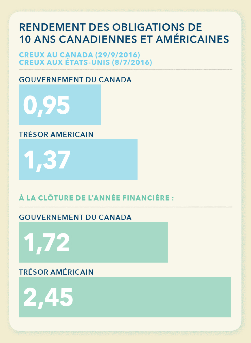 Les événements qui ont marqué les marchés le plus en 2016 étaient dans la domaine de la politique. Le Brexit a eu l’effet d’une onde de choc sur la valeur des titres à l’échelle mondiale et a plongé les rendements obligataires mondiaux dans un creux historique. L’amélioration des données économiques a toutefois fait en sorte que la période de liquidation de ces titres a été de courte durée. La reprise des marchés a été encore plus rapide après la victoire inattendue de Donald Trump aux élections présidentielles américaines. Le Dow Jones a connu la plus importante hausse à la suite d’élections présidentielles américaines vue à ce jour, soit huit % au cours des cinq semaines suivant la victoire de Trump.