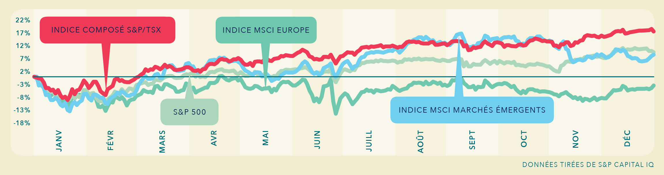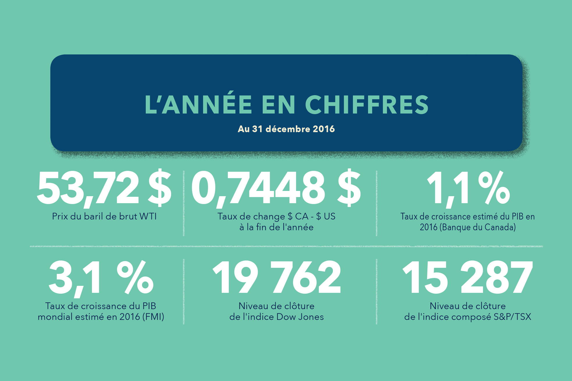 Les marchés ont connu une année à tout le moins mouvementée, marquée d’une correction radicale en janvier, de la surprise du Brexit et de la victoire inattendue de Donald Trump. Malgré tout, les actions ont terminé l’année en force grâce aux gains réalisés sur les marchés développés et ceux en développement, particulièrement au Canada et aux États-Unis. Quels événements politiques et économiques expliquent cette stimulation? Et que pourrait-t-il arriver en 2017?