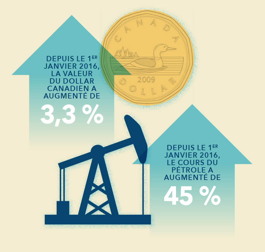 Le cours du pétrole brut et la valeur du dollar évoluent souvent parallèlement, mais cette tendance s’est estompée au deuxième semestre de 2016. En janvier, la chute du cours du pétrole brut a fait glisser le dollar canadien sous la barre des 69 cents US. La tendance s’est ensuite renversée jusqu’en mai. D’une valeur de 80 cents US, le dollar canadien a alors amorcé une descente pour ne valoir que 74 cents à la fin de l’année. Le cours du pétrole a quant à lui grimpé de 10 dollars pendant cette même période, poussé par la décision de l’OPEP, en novembre, de restreindre la production. Qu’est-ce qui explique un tel changement? La pression qu’a exercée l’écart croissant entre les taux d’intérêt des États-Unis et du Canada. De meilleures perspectives du côté du pétrole pourraient néanmoins en atténuer les répercussions sur le dollar canadien.