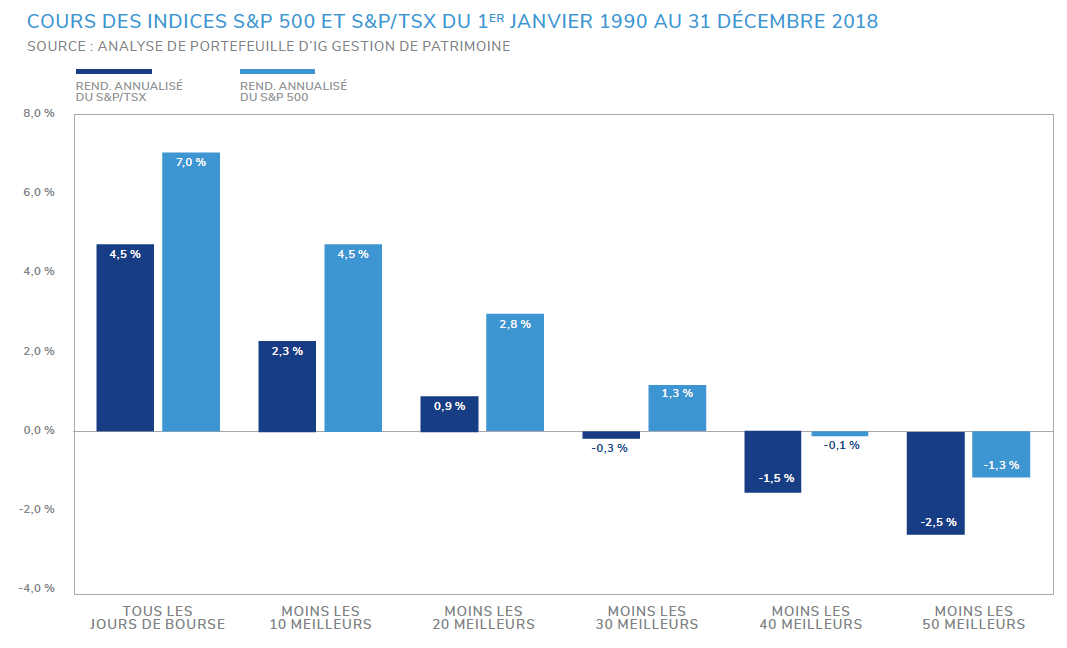 Par exemple, l’investisseur qui a conservé ses positions dans l’indice composé S&P 500 du 1er janvier 1990 au 31 décembre 2018 a obtenu un rendement annuel de 7,0 % (dividendes non compris). En revanche, celui qui a raté les 50 meilleurs jours du S&P 500 sur la même période a obtenu un rendement annuel composé de -1,3 % (dividendes non compris). Et ces jours ne représentent que 1 % du total des séances boursières.