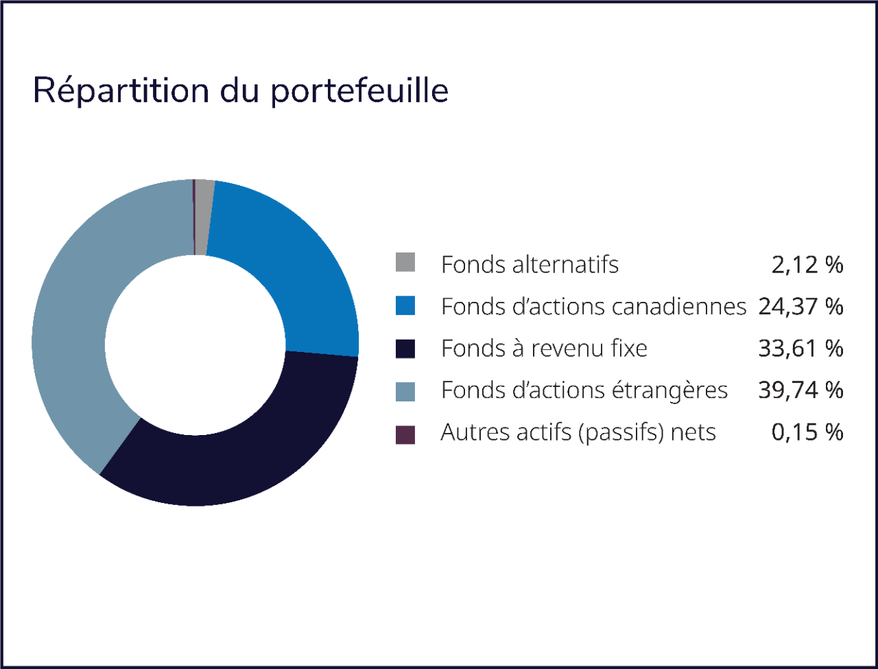 Le Portefeuille de revenu équilibré à risque géré IG (série U) a progressé de 1,0 % au cours du troisième trimestre. Le portefeuille a surtout tiré parti de son exposition aux actions. À une exception près, toutes les composantes actives d’actions ont généré des rendements positifs. D’un point de vue géographique, la répartition dans les actions canadiennes a offert la plus importante contribution au rendement. Du point de vue du style, les actions à faible volatilité ont le plus contribué au rendement. L’exposition au secteur canadien de l’immobilier par l’intermédiaire du Fonds de biens immobiliers a également généré des gains robustes. Alors que la répartition en titres à revenu fixe dans son ensemble n’a dégagé que de légers gains au cours du trimestre, le Fonds en gestion commune mondial lié à l’inflation a figuré parmi les plus importants contributeurs, alors que la répartition dans le Fonds d’obligations de sociétés canadiennes Mackenzie – IG et le Fonds d’obligations canadiennes Mackenzie – IG a nui au rendement. En raison de la nature mondiale du portefeuille, le repli du dollar canadien s’est traduit par une contribution positive au rendement.