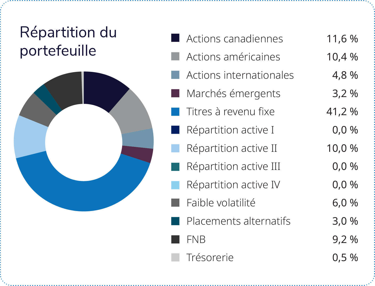 Le Fonds privé de titres à revenu fixe Profil (+0,24 %) est le Fonds Profil le plus fortement représenté dans le portefeuille et a donc contribué positivement au rendement total malgré sa modeste avancée. Soutenu par des gains dans ses segments des obligations à rendement élevé, des obligations à court terme et des biens immobiliers, le Fonds a surpassé son groupe de comparaison des titres à revenu fixe mondiaux, malgré le recul de deux de ses trois principales composantes (obligations mondiales et multistratégie à revenu fixe).