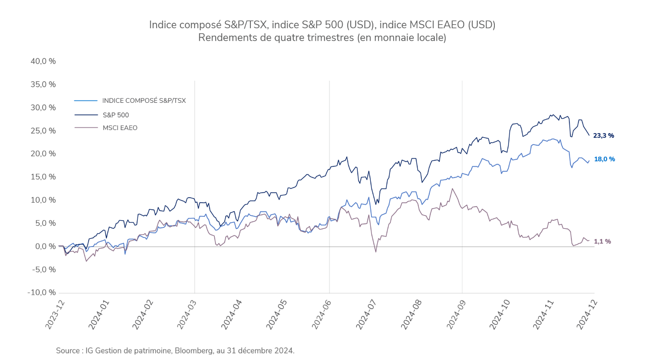 L’optimisme était de mise en ce quatrième trimestre de 2024, avec une remontée des actions pour terminer l’année. Trois thèmes déterminants ont façonné le trimestre : une élection présidentielle historique aux États-Unis, la poursuite des baisses de taux par les banques centrales, et une hausse des risques politiques, au pays et à l’étranger. Ces facteurs ont dicté les mouvements des marchés et créé un contexte à la fois propice à l’optimisme et payant pour les investisseurs, après une élection américaine décisive.