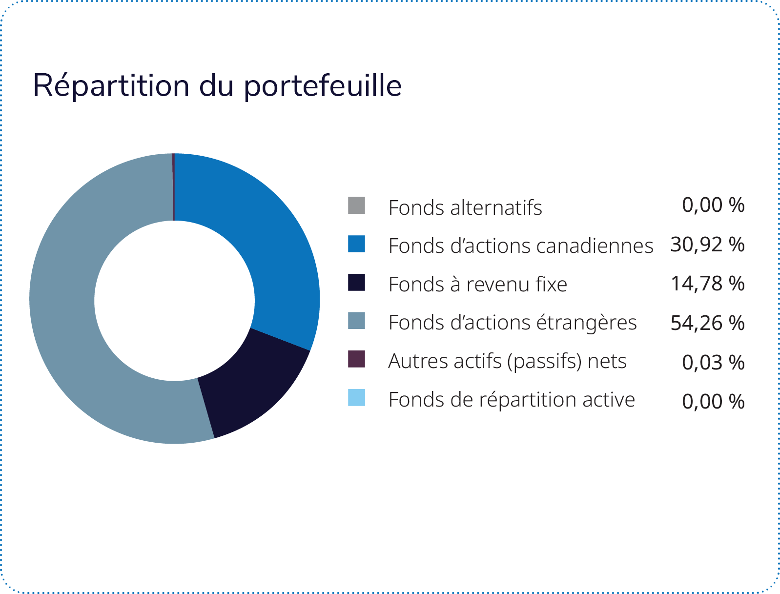 Le Fonds d’actions canadiennes à faible volatilité Mackenzie – IG Mandat privé, le Fonds d’actions Mackenzie – IG et le fonds SPDR S&P 500 ETF Trust ont le plus contribué au rendement. Le Fonds d’actions canadiennes à faible volatilité Mackenzie – IG Mandat privé a surpassé son indice de référence, profitant de la surpondération du secteur de l’énergie et de la sous-pondération relative du secteur des services de communication. La sélection des titres des secteurs de l’énergie et de la finance est l’un des facteurs qui ont le plus nui au rendement relatif supérieur du Fonds. Le Fonds d’actions Mackenzie – IG a inscrit un rendement supérieur à celui de son indice de référence. La sous-pondération des secteurs de la santé et des matériaux a contribué au rendement relatif supérieur. La préférence accordée aux actions plutôt qu’aux titres à revenu fixe a eu un effet positif sur le rendement du portefeuille au quatrième trimestre de 2024. La part importante allouée au fonds SPDR S&P 500 ETF Trust a également été profitable.