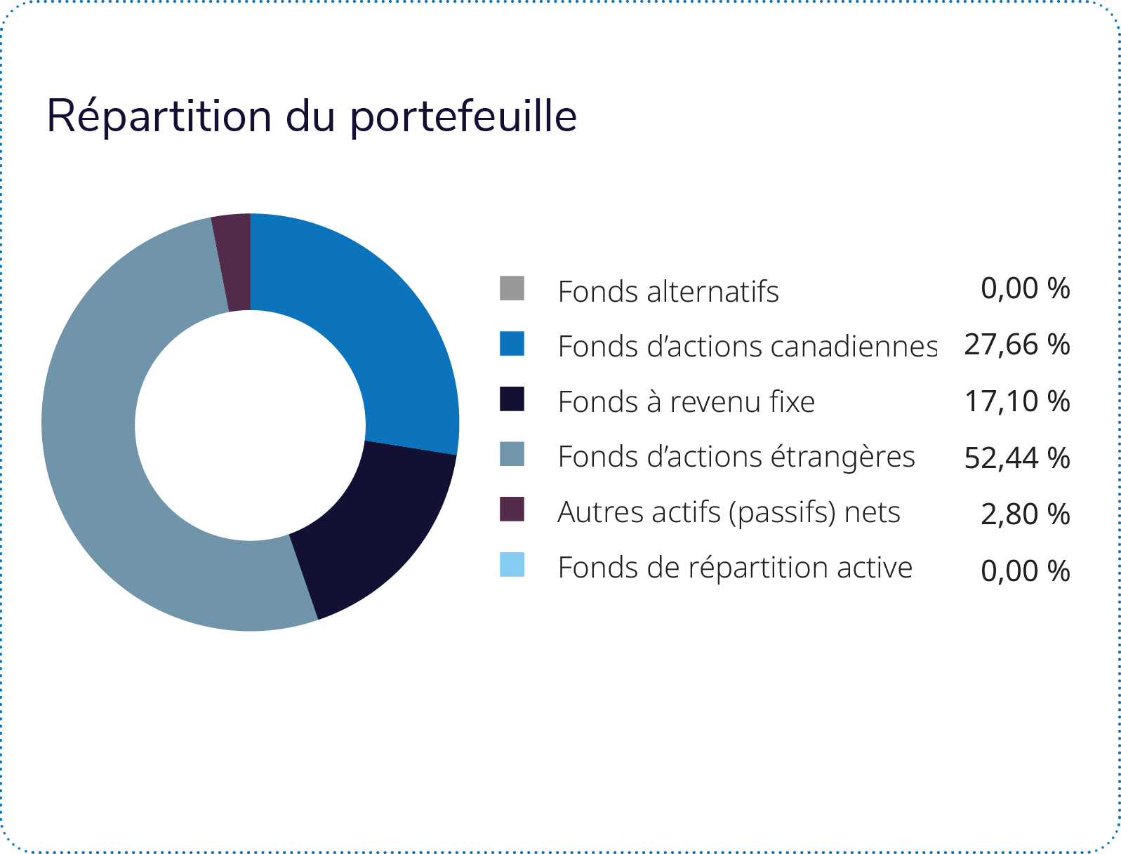 La répartition de l’actif a contribué au rendement du portefeuille au cours du trimestre. Nous avons conservé la surpondération des actions et nous avons maintenu une duration inférieure à celle de l’indice de référence. Du côté des actions américaines, la répartition sectorielle a eu un effet positif au cours du trimestre. La surpondération du secteur de la consommation discrétionnaire et la sous-pondération du secteur de la santé ont contribué au rendement, alors que la sous-pondération du secteur de la finance lui a nui. La répartition géographique a aussi été avantageuse. Du côté des actions, la surpondération de Taïwan et des États-Unis a favorisé le rendement, contrairement à la surpondération de l’Espagne et de la Suède qui a été désavantageuse en raison de la croissance plus lente dans la zone euro durant le trimestre. La sélection des gestionnaires a pesé sur le rendement durant la période. Ainsi, le placement dans le Fonds en gestion commune d’actions américaines T. Rowe Price – IG, qui a accusé du retard par rapport à son indice de référence, a entravé le rendement.