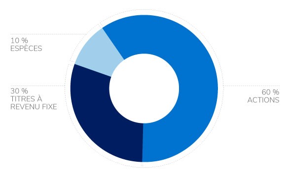 L’équilibrage entre chaque catégorie d’actif est fonction du profil d’investisseur que vous avez établi avec votre conseiller IG selon vos objectifs de placement et votre tolérance au risque. Le graphique ci-dessous illustre un portefeuille équilibré type :