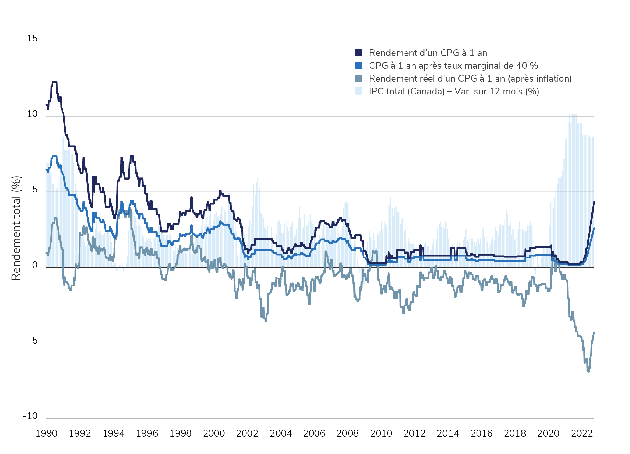 Prenons l’exemple de 2022 : cette année-là, l’inflation au Canada s’est établie à 6,8 % en moyenne. Par contre, les rendements moyens des placements sûrs pour la même année ont été considérablement moins élevés :