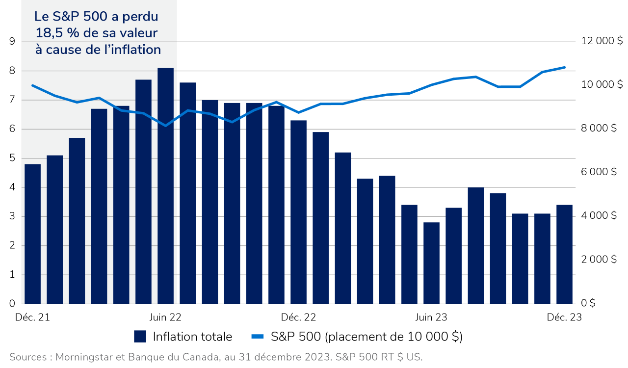 Le graphique ci-dessous illustre l’impact qu’a récemment eu l’inflation sur le marché boursier américain. En 2022, lorsque l’inflation s’est envolée, le marché boursier américain a connu le mouvement inverse et a perdu de la valeur. Or, quand l’inflation a commencé à se résorber en 2023, le marché boursier s’est redressé.