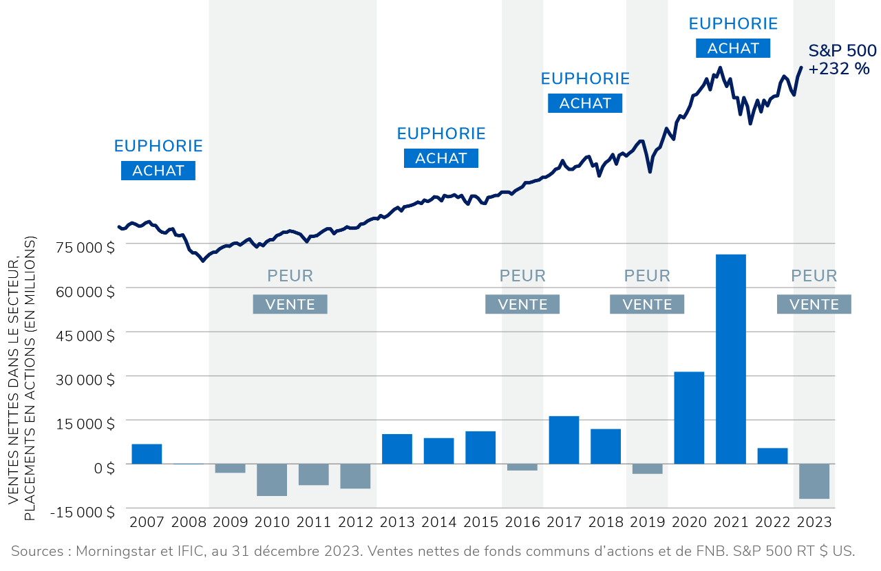 Pourquoi les facteurs comportementaux sont-ils si importants? Ils nuisent souvent à la prise de décision, notamment lorsque les émotions prennent le dessus, et provoquent des réactions impulsives. Comme le montre le tableau ci-dessous, les investisseurs et investisseuses ont tendance à acheter davantage lorsque les marchés sont élevés et à vendre lorsqu’ils baissent.