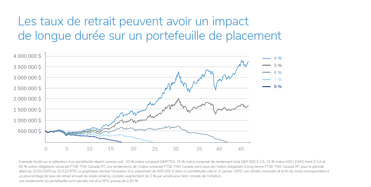 [1] L’illustration est basée sur un portefeuille composé à : 30 % de l’indice composé S&P/TSX RT; 15 % du S&P 500 RT $ CA; 15 % du MSCI EAEO (net) $ CA et 40 % de l’indice obligataire universel FTSE TMX Canada RT. Les rendements inscrits pour l’indice obligataire universel FTSE TMX Canada sont fonction de l’indice obligataire à long terme FTSE TMX Canada RT pour la période du 01/01/1970 au 31/12/1979. Le graphique indique les fluctuations d’un placement de 500 000 $ dans le portefeuille à compter du 01/01/1970. Les retraits mensuels (à la fin du mois) correspondent à un pourcentage (le taux de retrait annuel) du solde initial du compte, augmentant de 2 % par année pour tenir compte de l’inflation. Les rendements du portefeuille sont calculés nets d’un RFG annuel de 2,50 %.