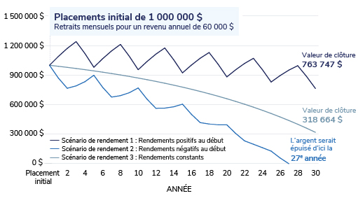 Lorsque votre portefeuille perd de la valeur (produit un rendement négatif) au début de votre retraite, le montant de base qui peut générer des rendements positifs diminue, ce qui a pour effet de réduire votre potentiel de croissance. Les retraits prélevés sur ce montant réduisent aussi sa valeur (et peuvent entraîner un déficit permanent).
