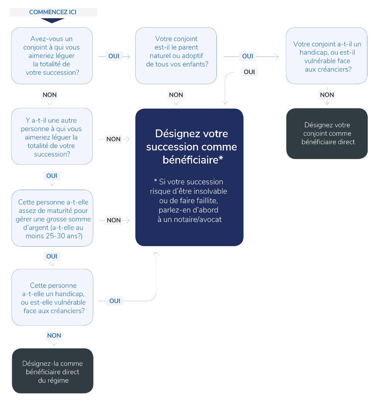 La désignation d’un bénéficiaire direct est toutefois déconseillée à beaucoup de titulaires de régime ou de police, car leur situation familiale non conventionnelle pourrait se traduire par des conséquences fiscales défavorables pour le bénéficiaire. Nous avons créé un arbre de décision pour la désignation de bénéficiaires qui vous aidera à comprendre les facteurs à prendre en compte avant de désigner un bénéficiaire pour votre régime ou votre police.