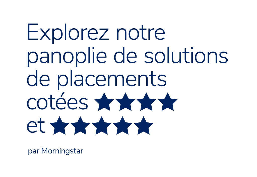 La Cote Morningstar reflète le rendement des titres de la série F (la série I dans le cas des Fonds Profil) au 31 décembre 2024 et est susceptible de varier tous les mois. La cotation est une évaluation objective quantitative du rendement ajusté en fonction du risque d’un fonds par rapport à celui des autres fonds de sa catégorie. Seuls les fonds qui existent depuis au moins trois ans peuvent figurer au classement. La cotation globale d’un fonds représente la moyenne pondérée des rendements sur trois, cinq et dix ans, le cas échéant, en fonction des rendements des bons du Trésor à 91 jours et du groupe d’homologues. Un fonds ne peut être coté que si le groupe d’homologues contient suffisamment de fonds pour permettre une comparaison sur au moins trois ans. Si un fonds se retrouve parmi les meilleurs 10 % de sa catégorie, il reçoit cinq étoiles; s’il obtient un résultat parmi les 22,5 % suivants, il obtient quatre étoiles; une place parmi les 35 % du milieu lui vaut trois étoiles; ceux dans les 22,5 % qui suivent reçoivent deux étoiles; et les derniers 10 % se voient attribuer une étoile. Ces cotes sont un facteur parmi d’autres à envisager avant d’investir. Pour plus d’information, contactez Morningstar au 1-800-531-4725, www.morningstar.ca ou votre conseiller ou conseillère IG Gestion de patrimoine. Les classements par quartile et le nombre d’homologues surpassés sont calculés par IG Gestion de patrimoine en fonction des données au niveau de la série du fonds fournies par Morningstar. Les catégories du CIFSC, les cotes étoiles, le nombre de fonds dans chaque catégorie et les taux de rendement pour les périodes standards sont les suivants : Solutions de portefeuilles : Fonds privé de répartition active Profil, série II, catégorie Équilibrés tactiques : 1 an – (289 fonds), 3 ans – 4 étoiles (287 fonds), 5 ans – cote étoile s. o., rendement s. o., 10 ans/depuis la création (15 mars 2021) – cote étoile s. o. Fonds privé de marchés émergents Profil, série I, catégorie Actions de marchés émergents : 1 an – (276 fonds), 3 ans – 3 étoiles (243 fonds), 5 ans – 4 étoiles (210 fonds), 10 ans/depuis la création (15 janvier 2001) – 5 étoiles (117 fonds). Fonds privé de FNB Profil, série I, catégorie Actions mondiales : 1 an – (1 785 fonds), 3 ans – 5 étoiles (1 530 fonds), 5 ans – cote étoile s. o. (1 282 fonds), rendement s. o., 10 ans/depuis la création (15 mars 2021) – cote étoile s. o. (648 fonds). Fonds privé de titres à revenu fixe Profil, série I, catégorie Revenu fixe mondial : 1 an – (488 fonds), 3 ans – 4 étoiles (359 fonds), 5 ans – 4 étoiles (246 fonds), 10 ans/depuis la création (15 janvier 2001) – 5 étoiles (107 fonds). Portefeuille équilibré d’actions mondiales Profil, catégorie Équilibrés mondiaux d’actions : 1 an – (1 184 fonds), 3 ans – 4 étoiles (1 077 fonds), 5 ans – cote étoile s. o., rendement s. o., 10 ans/depuis la création (22 juin 2020) – cote étoile s. o. Portefeuille d’actions mondiales Profil, série I, catégorie Actions mondiales : 1 an – (1 785 fonds), 3 ans – 4 étoiles (1 530 fonds), 5 ans – cote étoile s. o., rendement s. o., 10 ans/depuis la création (22 juin 2020) – cote étoile s. o. Portefeuille équilibré de revenu fixe mondial Profil, catégorie Équilibrés mondiaux à revenu fixe : 1 an – (886 fonds), 3 ans – 4 étoiles (803 fonds), 5 ans – cote étoile s. o. (706 fonds), rendement s. o., 10 ans/depuis la création (22 juin 2020) – cote étoile s. o. Portefeuille équilibré mondial neutre Profil, catégorie Équilibrés mondiaux neutres : 1 an – (1 598 fonds), 3 ans – 4 étoiles (1 430 fonds), 5 ans – cote étoile s. o. (1 210 fonds), rendement s. o., 10 ans/depuis la création (22 juin 2020) – cote étoile s. o. Fonds privé d’actions internationales Profil, série I, catégorie Actions internationales : 1 an – (647 fonds), 3 ans – 4 étoiles (588 fonds), 5 ans – 4 étoiles (542 fonds), 10 ans/depuis la création (15 janvier 2001) – 4 étoiles (297 fonds). Fonds privé à faible volatilité Profil, série I, catégorie Actions mondiales : 1 an – (1 785 fonds), 3 ans – 4 étoiles (1 530 fonds), 5 ans – cote étoile s. o. (1 282 fonds), rendement s. o., 10 ans/depuis la création (15 mars 2021) – cote étoile s. o. Fonds privé d’actions américaines Profil, série I, catégorie Actions américaines : 1 an – (1 156 fonds), 3 ans – 5 étoiles (1 001 fonds), 5 ans – 5 étoiles (876 fonds), 10 ans/depuis la création (1er mars 2013) – 5 étoiles (550 fonds). Portefeuille fondamental IG – Revenu plus, série F, catégorie Équilibrés canadiens à revenu fixe : 1 an – (373 fonds), 3 ans – 3 étoiles (349 fonds), 5 ans – 3 étoiles (312 fonds), 10 ans/depuis la création (12 juillet 2013) – 4 étoiles (214 fonds). Portefeuille fondamental IG – Équilibré, série F, catégorie Équilibrés mondiaux neutres : 1 an – (1 598 fonds), 3 ans – 4 étoiles (1 430 fonds), 5 ans – 4 étoiles (1 210 fonds), 10 ans/depuis la création (7 janvier 2019) – 4 étoiles (706 fonds). Portefeuille fondamental IG – Équilibré Croissance, série F, catégorie Équilibrés mondiaux neutres : 1 an – (1 184 fonds), 3 ans – 4 étoiles (1 077 fonds), 5 ans – 4 étoiles (908 fonds), 10 ans/depuis la création (12 juillet 2013) – 4 étoiles (526 fonds). Portefeuille fondamental IG – Mondial Revenu, série F, catégorie Revenu fixe mondial : 1 an – (488 fonds), 3 ans – 4 étoiles (359 fonds), 5 ans – 4 étoiles (246 fonds), 10 ans/depuis la création (16 juillet 2014) – 5 étoiles (107 fonds). Portefeuille fondamental IG – Croissance, série F, catégorie Actions mondiales : 1 an – (1 785 fonds), 16,8 %; 3 ans – 4 étoiles (1 530 fonds); 5 ans – 4 étoiles (1 282 fonds), 10 ans/depuis la création (1er juillet 2019) – 3 étoiles (648 fonds). Por