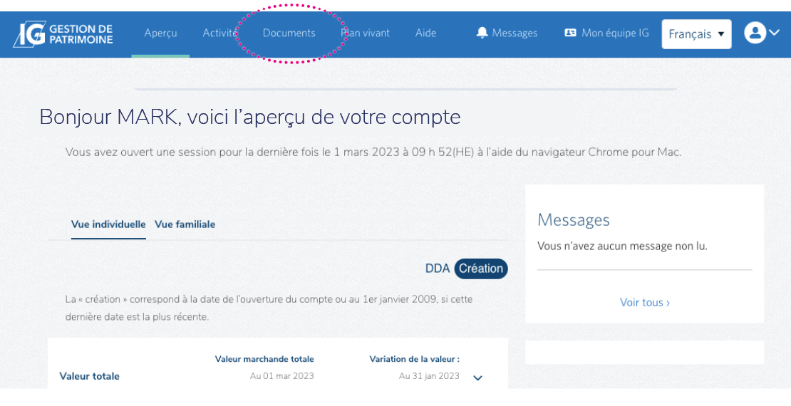 À la page Aperçu, cliquez sur Documents dans le menu principal (le ruban bleu dans le haut de l’écran).