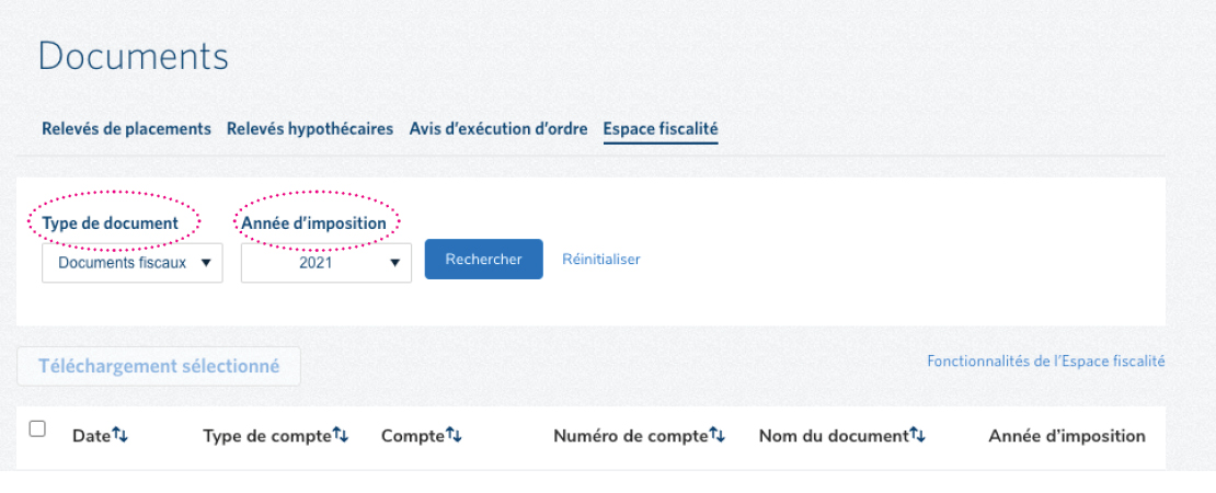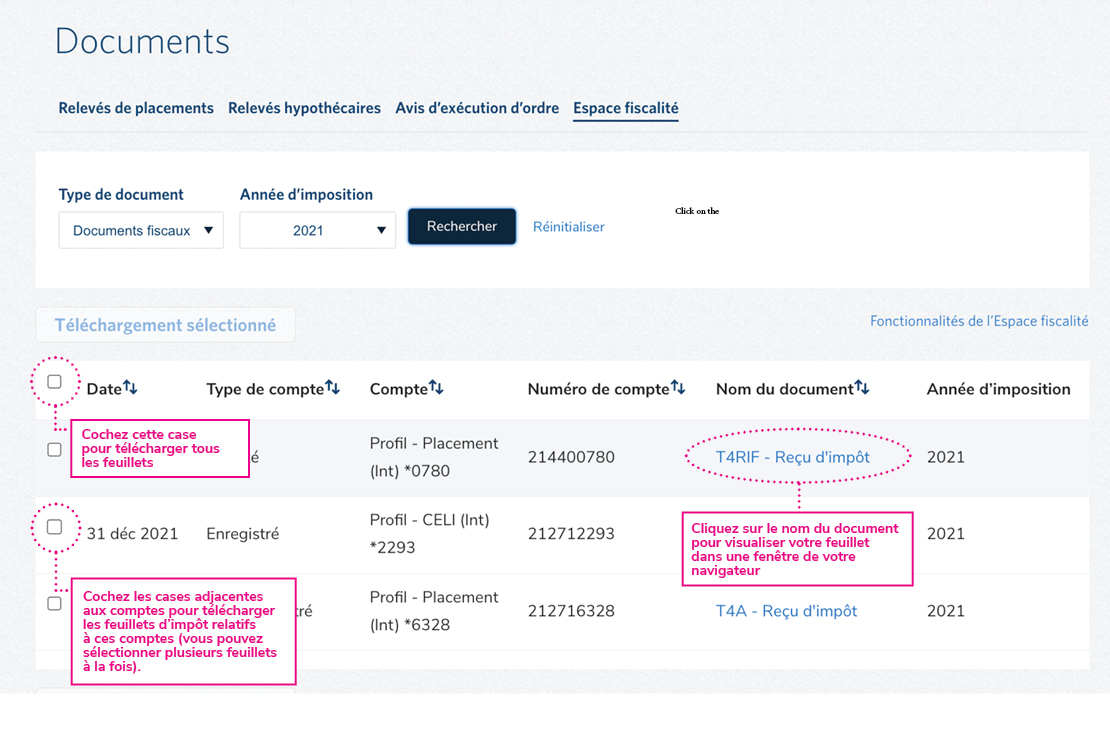 Pour consulter vos feuillets d’impôt, sélectionnez « Documents fiscaux » dans la liste déroulante intitulée Type de document et choisissez une Année d’imposition. Cliquez sur le bouton Rechercher pour afficher la liste des feuillets d’impôt pour l’année choisie. Les feuillets d’impôt des sept dernières années sont disponibles.