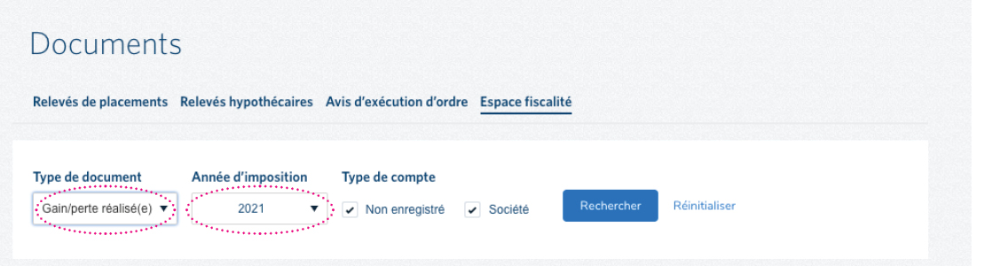 Pour consulter les rapports sur les gains et pertes réalisé(e)s relatifs à vos comptes non enregistrés et de société, sélectionnez « Gain/perte réalisé(e) » dans la liste déroulante Type de document, puis sélectionnez l’Année d’imposition souhaitée. Cliquez sur le bouton Rechercher. Veuillez noter que les rapports sur les gains et pertes réalisé(e)s ne sont disponibles que pour les années 2021 et suivantes.