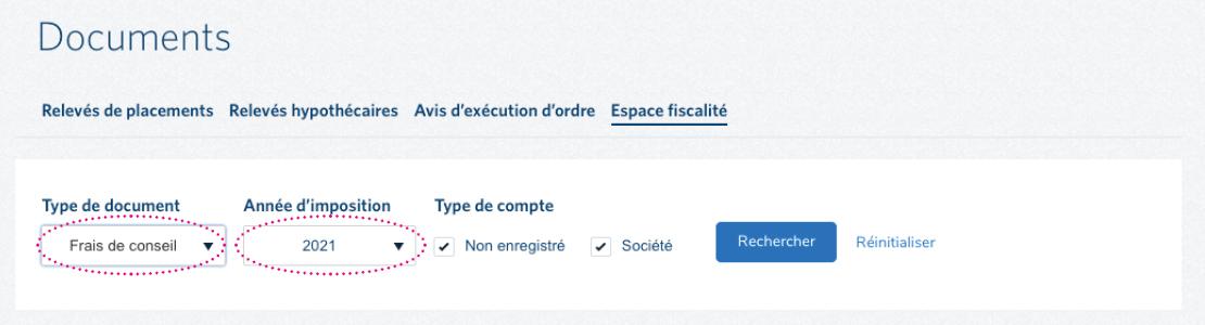 Pour consulter le rapport annuel des frais de conseil relatifs à vos comptes non enregistrés et de société, sélectionnez « Frais de conseil » dans la liste Type de document et choisissez l’Année d’imposition souhaitée. Cliquez sur le bouton Rechercher. Veuillez noter que les rapports sur les frais de conseil ne sont disponibles que pour les années 2021 et suivantes.
