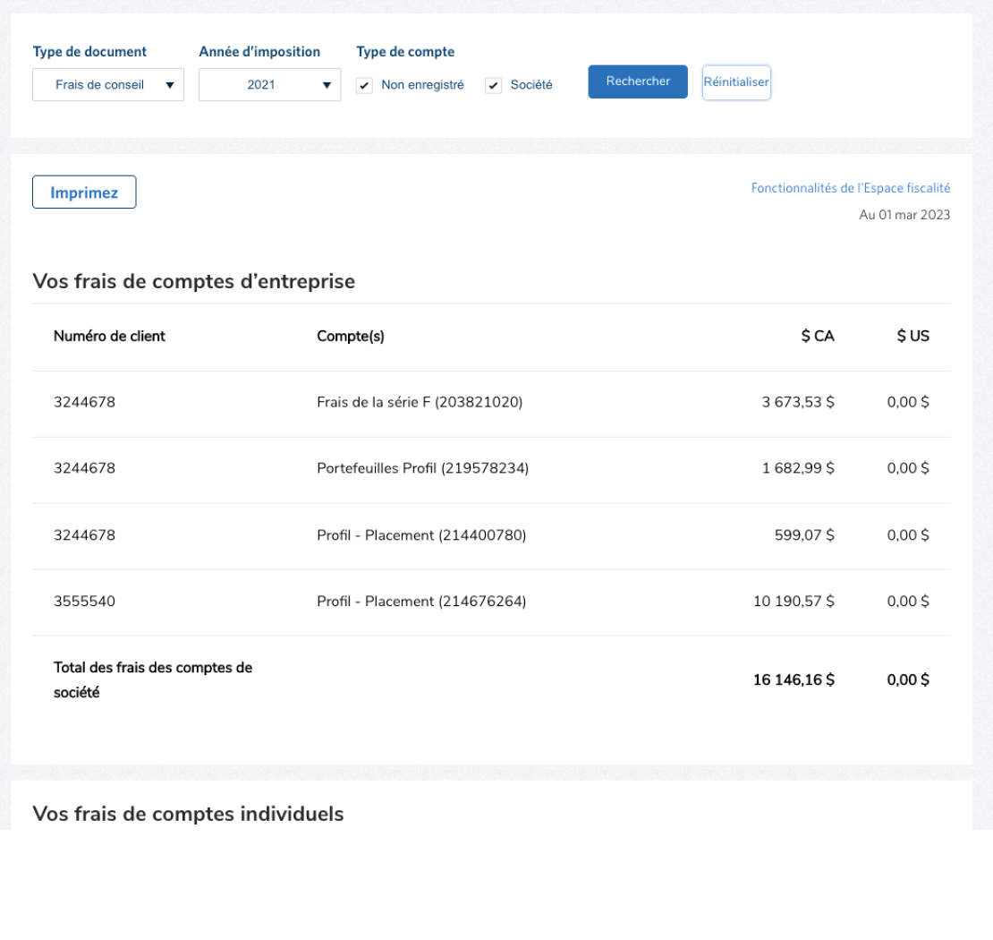 Les rapports sur les frais de conseil relatifs à tous les types de comptes sélectionnés s’afficheront (chaque compte sera identifié par son « Numéro de compte »).